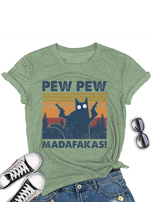 T-shirt da donna con stampa di un gatto nero con una pistola